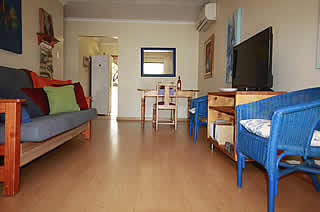 Spacious and fully equipped for self-catering, our family-friendly apartment provides a welcoming warm atmosphere where guests feel right at home. We rent it out as a complete unit. The cottage offers a kitchen, fully equipped for self-catering, with complementary tea and coffee. The living area has a large screen TV with full DSTV (satellite television). Two private bedrooms are serviced by one central bathroom with a shower. The first bedroom has a double bed, the other has two ¾ beds. Percale cotton linen and cotton towels are included in the price.